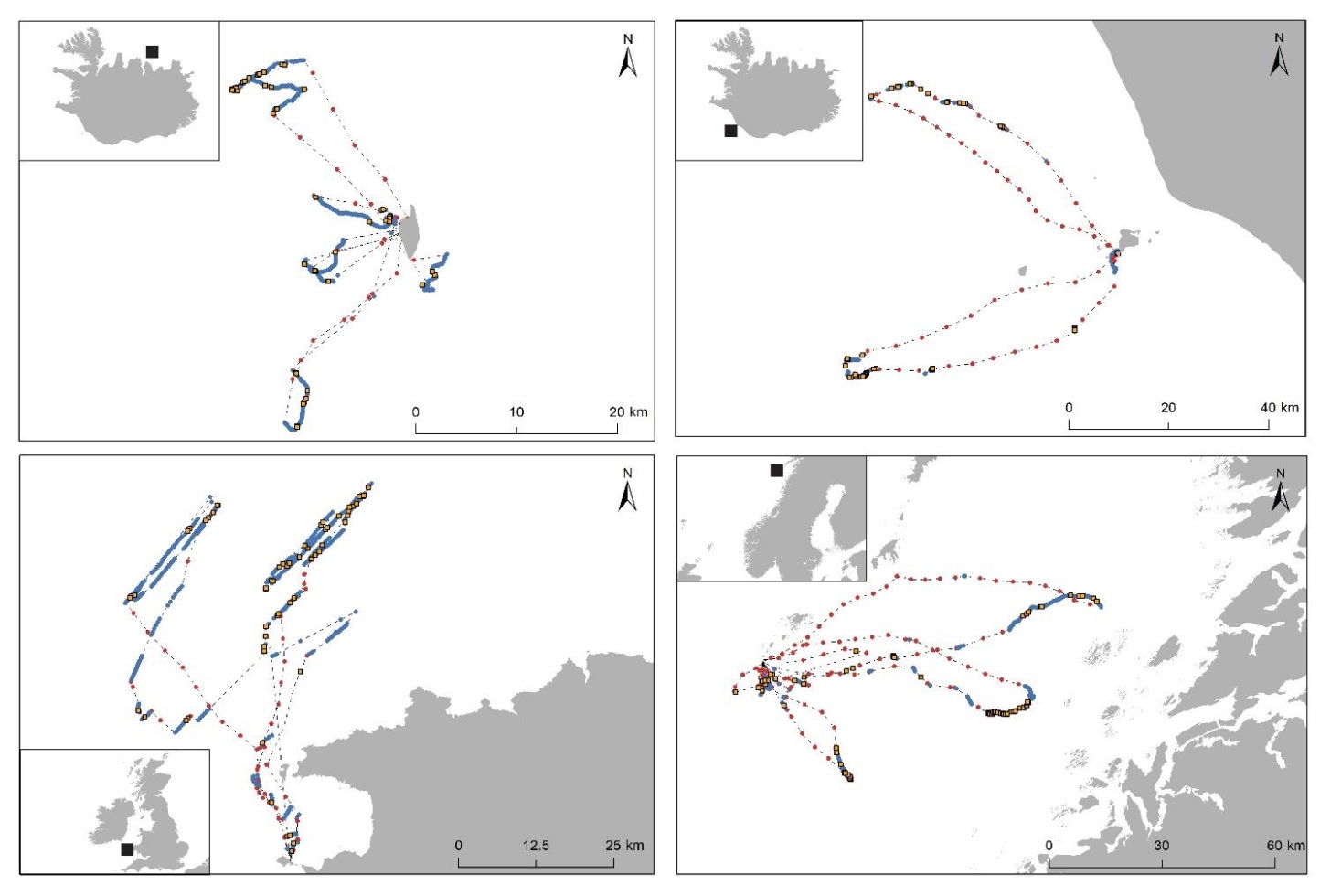 Examples of feeding trips from the four colonies, with a scale for comparison. The red dots indicate points of high speed (i.e. flight) and blue lower speed, when the birds are sitting on the water and are either feeding or resting. Image from the Supplementary Material of the paper. A Fayet.
