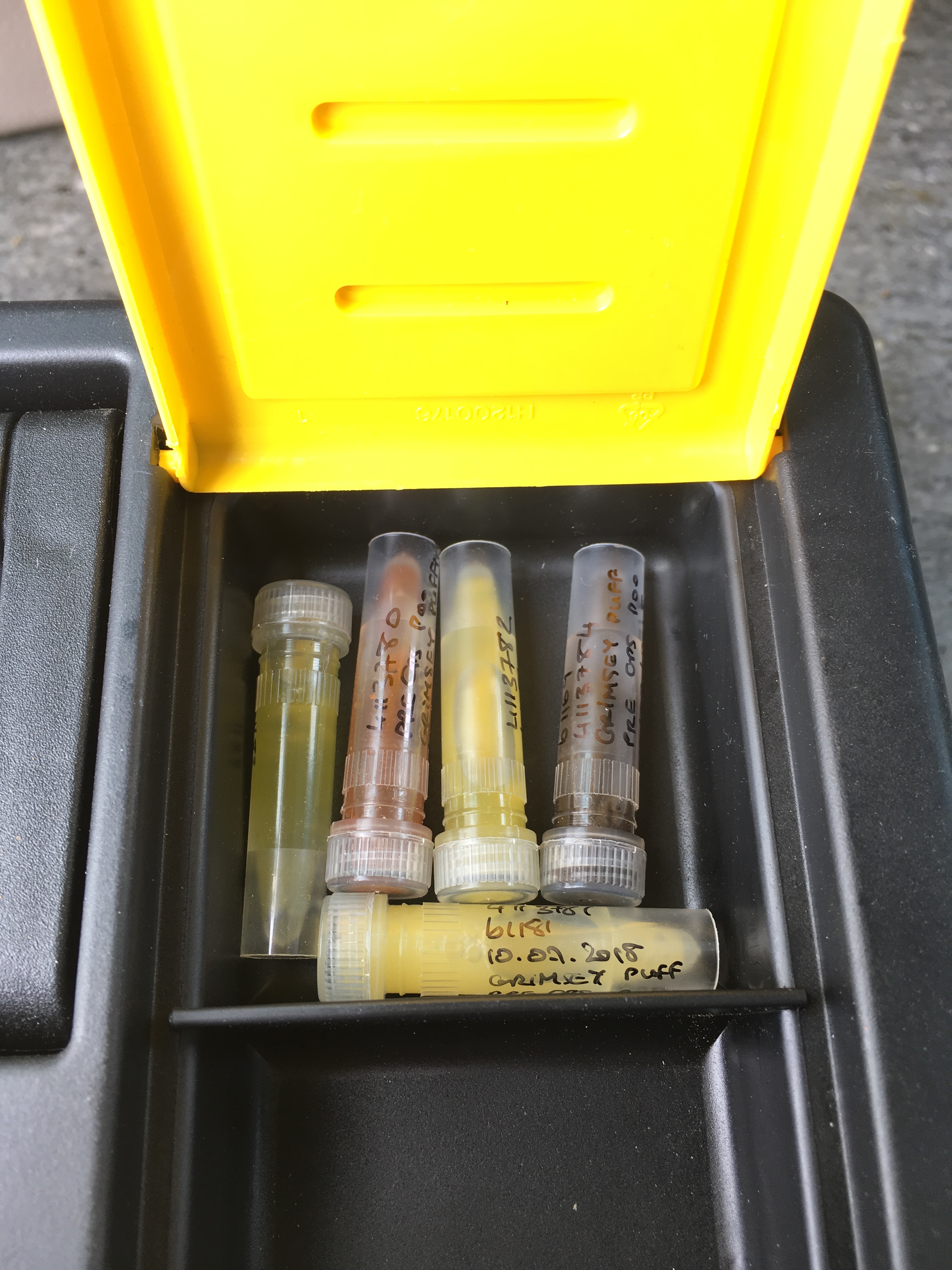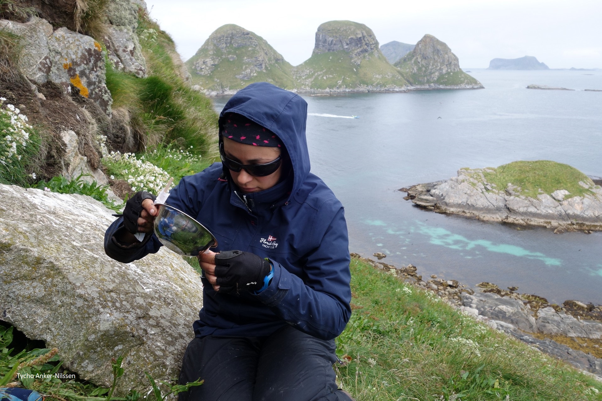 Left: collecting puffin poop in Norway (photo: T Anker-Nilssen). Centre: puffin faecal samples in tubes (photo: A Fayet). Right: deploying camera traps in Norway (photo: T Anker-Nilssen)